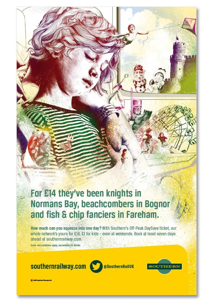 Southern wanted an integrated campaign to introduce their new DaySave ticket, allowing customers to roam their network, hopping on and off wherever they liked. We asked contemporary artist Gabriel Moreno to bring our contented DaySave customers to life.